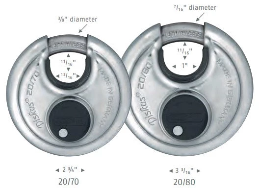 Abus 20/70 Diskus padlocks have a rounded shackle that is recessed on two sides of the lock body to prevent tampering. Abus developed the original round shaped Diskus padlocks over 70 years ago. The Abus 20/70 Diskus padlock is manufactured in Germany with exceptional workmanship in its welding.